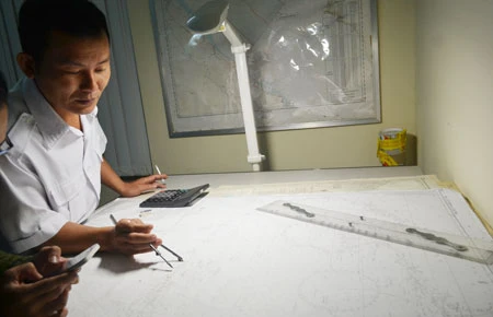 Anh Hồ Xuân Phong (nhân viên điện đài) chỉ rõ địa điểm tàu Trung Quốc ngăn cản tàu SAR 412 trên bản đồ. Ảnh: TT