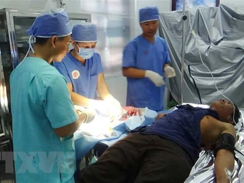 Các y, bác sĩ xã đảo Song Tử Tây đang phẫu thuật cho bệnh nhân Phạm Văn Khương. Ảnh: TTXVN