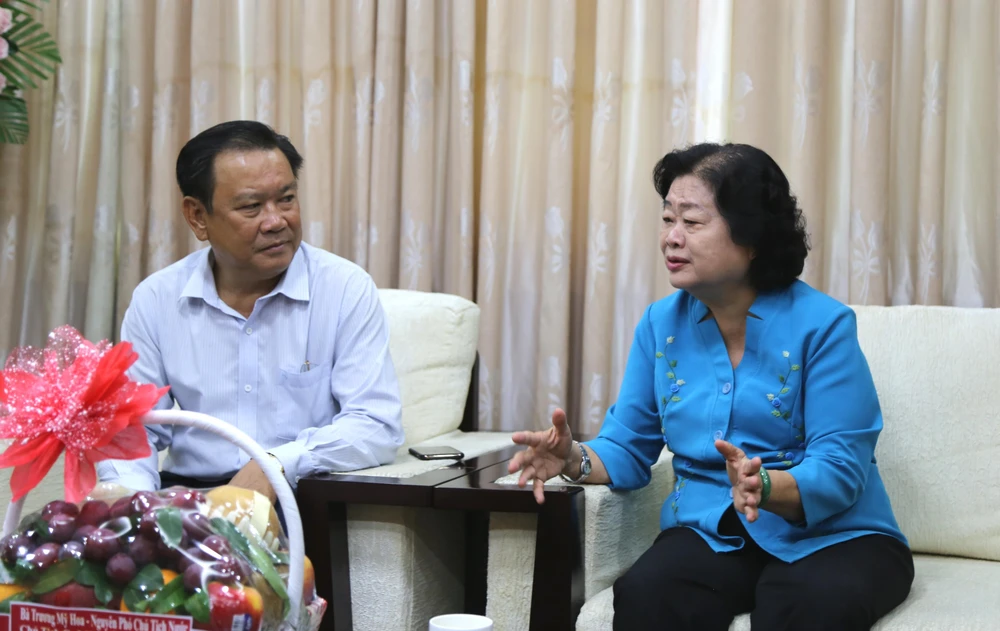 Bà Trương Mỹ Hoa (cựu Phó Chủ tịch nước) trao đổi với ông Mai Ngọc Phước, Tổng Biên tập Báo Pháp luật TP.HCM. Ảnh: QUANG DUY