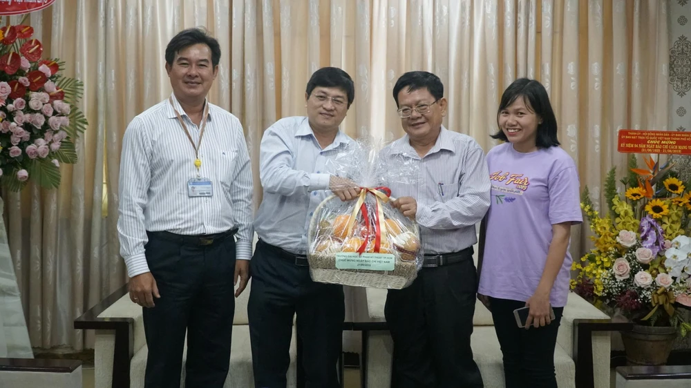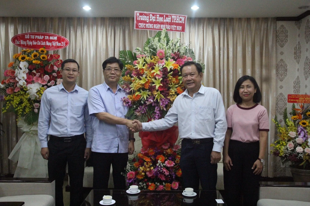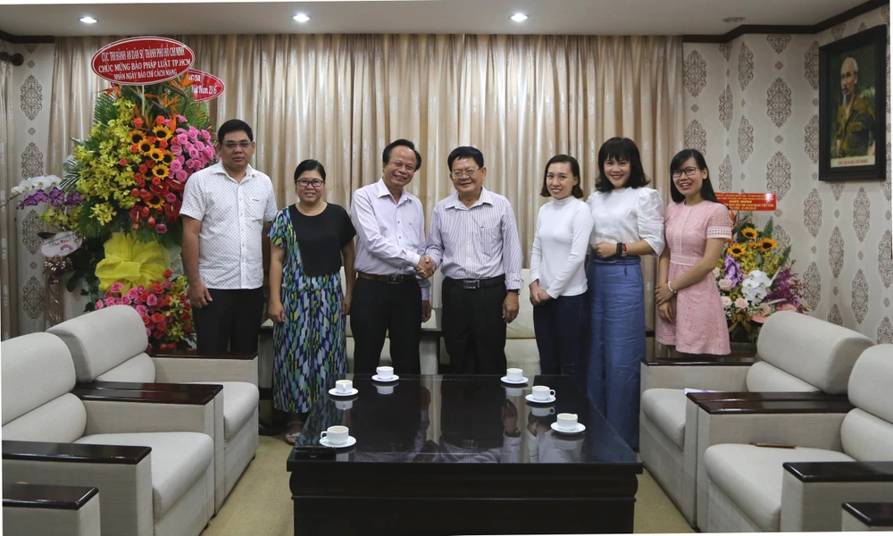 Ông Trần Hoàng Hải, Phó hiệu trưởng Trường Đại học Luật TP.HCM (thứ 2 từ trái qua) đến tặng hoa và chúc mừng Báo Pháp Luật TP.HCM. Ảnh: QUANG DUY