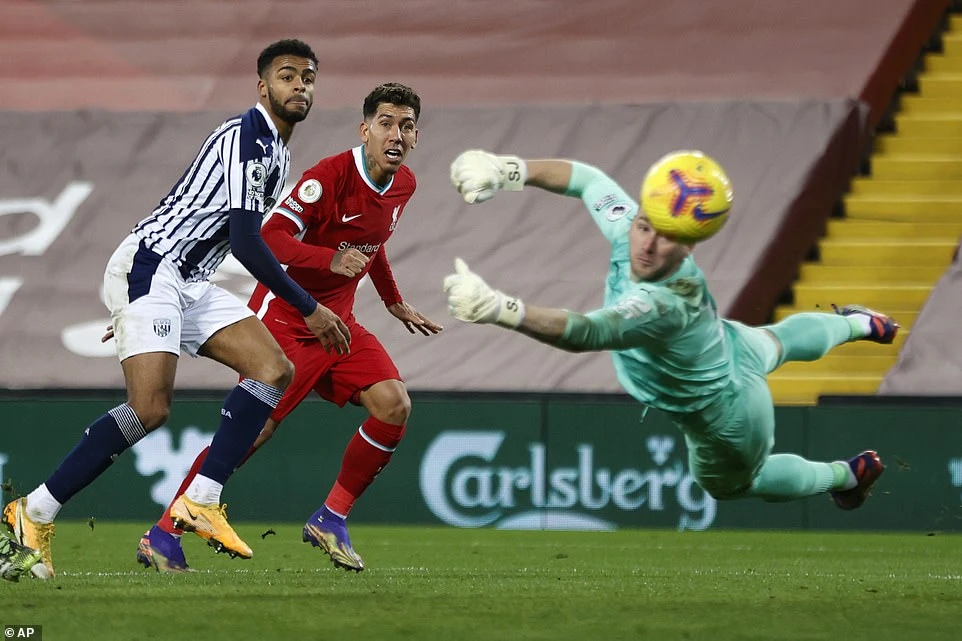 Firmino không thể ghi bàn vì sự xuất thần của Sam Johnstone. ẢNH: NMC POOL