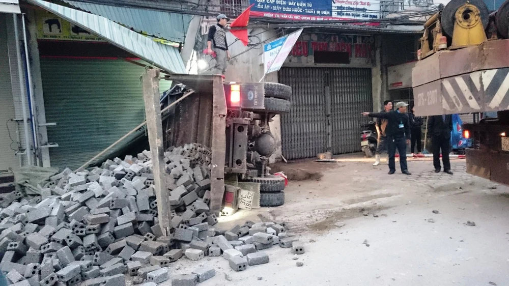 Cú tông mạnh khiến xe 37C-184.52 lao tới rồi đậm gãy cột điện bên quốc lộ, lật nghiêng trước cửa nhà dân. Vụ tai nạn khiến cabin xe tải 37C-184.52 bị bẹp dúm, tài xế là ông H. (40 tuổi) và con trai 14 tuổi (cùng trú huyện Yên Thành, Nghệ An) mắc kẹt trong cabin.
