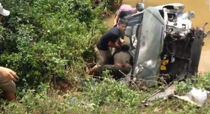 Đến vị trí trên, chiếc xe bất ngờ mất lái, lao lên mép cầu rồi lao xuống cống nước. Bánh trước của xe bị văng ra, chiếc xe lật nghiêng, rơi hẳn xuống mương nước, đầu xe hư hỏng nặng, kính chắn gió của xe bị vỡ nát.