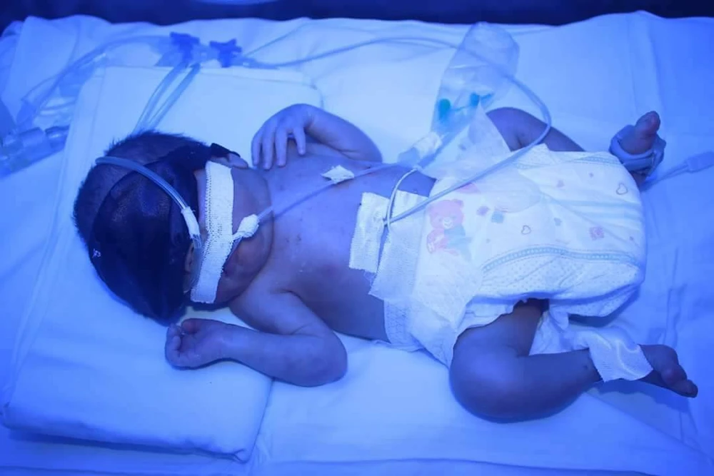 Ngay sau sinh, bé chỉ nặng 1,35 kg và suy hô hấp nặng nên được hỗ trợ thở áp lực dương liên tục qua đường mũi tại phòng sinh và lập tức chuyển vào đơn vị Hồi sức Nhi.
