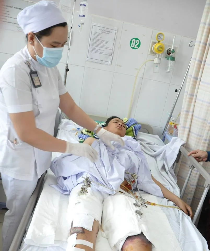 "Bắt đầu êkíp bác sĩ chấn thương chỉnh hình thực hiện cố định hai xương đùi bị gãy và khung chậu bằng khung cố định ngoài. Tiếp đến êkíp bác sĩ ngoại lồng ngực mạch máu nối tĩnh mạch đùi sau. Thứ ba là êkíp bác sĩ tiết niệu nam khoa thám sát bàng quang, niệu đạo và mở bàng quang (để tiểu) qua da. Cuối cùng là dẫn lưu máu tụ dưới da đùi, cắt lọc vùng bị lóc" - BS Hải cho biết thêm.