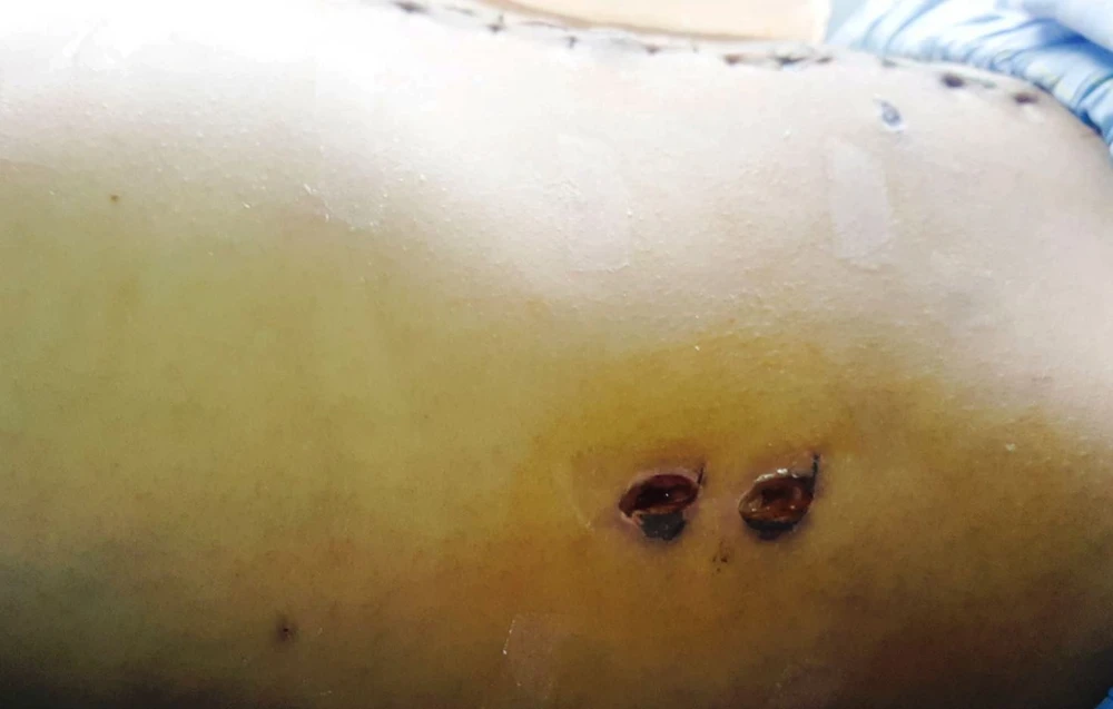 Qua thăm khám lâm sàng, êkíp cấp cứu và hội chẩn liên khoa Ngoại lồng ngực và Ngoại tiêu hóa đánh giá: bệnh nhân có chín vết thương kích thước 1 cm rải rác khắp vùng ngực, bụng; trong đó có vị trí rất nguy hiểm là vết thương thành trước ngực trái thuộc vùng “tam giác tim”. Bệnh nhân được chẩn đoán bị sốc đa vết thương do hỏa khí, vết thương ngực, theo dõi vết thương tim; vết thương thấu bụng, theo dõi thủng tạng rỗng.