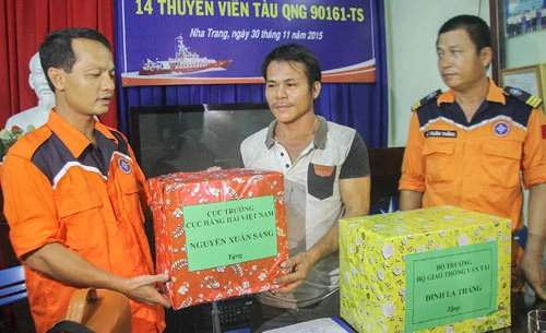 Đại diện Trung tâm Nha Trang MRCC tặng quà cho chủ tàu bị nạn