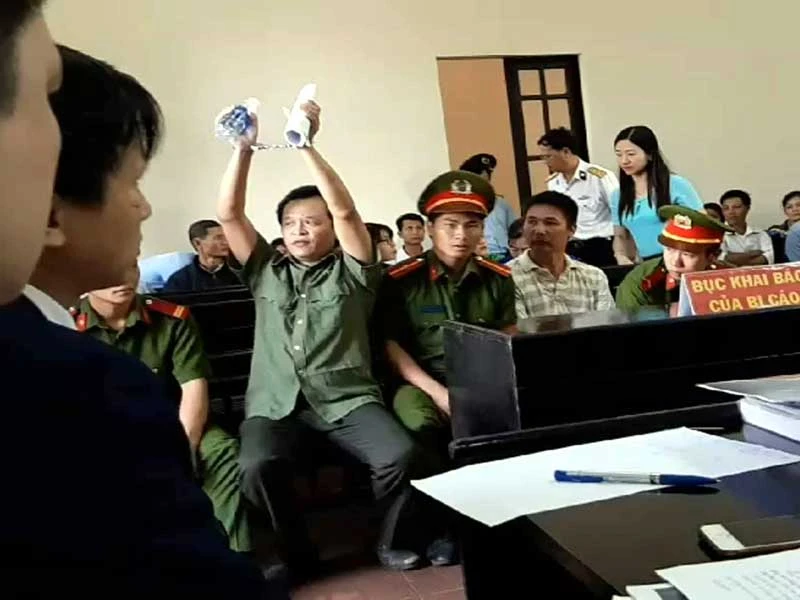Bị cáo Sáng giơ tay kêu oan tại phiên xử sơ thẩm hồi tháng 4-2018. Ảnh: YC