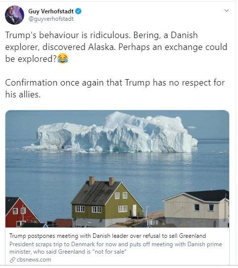 Ông Guy Verhofstadt gọi hành động của ông Trump là "buồn cười" và mỉa mai nên có một cuộc trao đổi Alaska với Greenland. Ảnh: Twitter