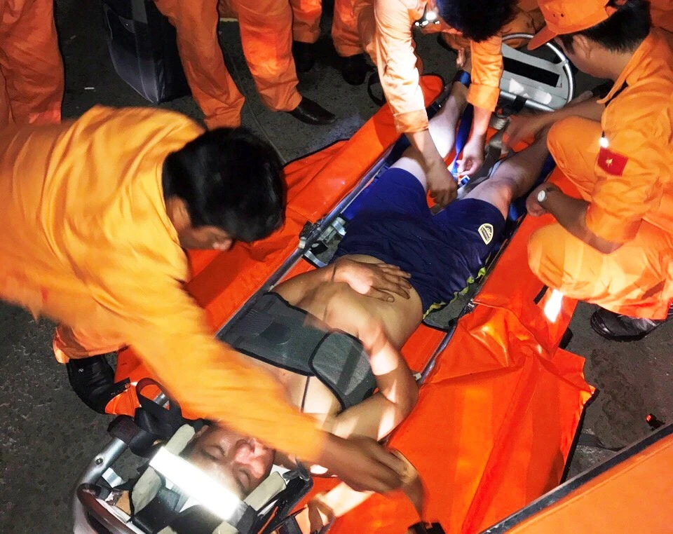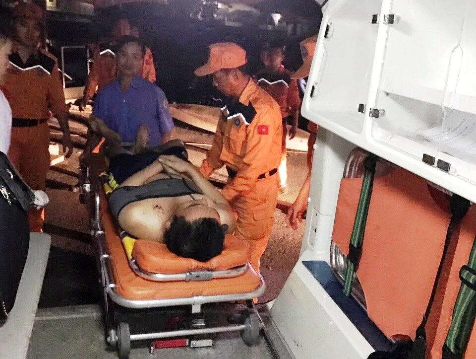Đưa thuyền viên Nguyễn Văn Vương, 27 tuổi, quê huyện Yên Thành, Nghệ An) lên bờ, để đưa đến bệnh viện cấp cứu. Ảnh: D.Công.