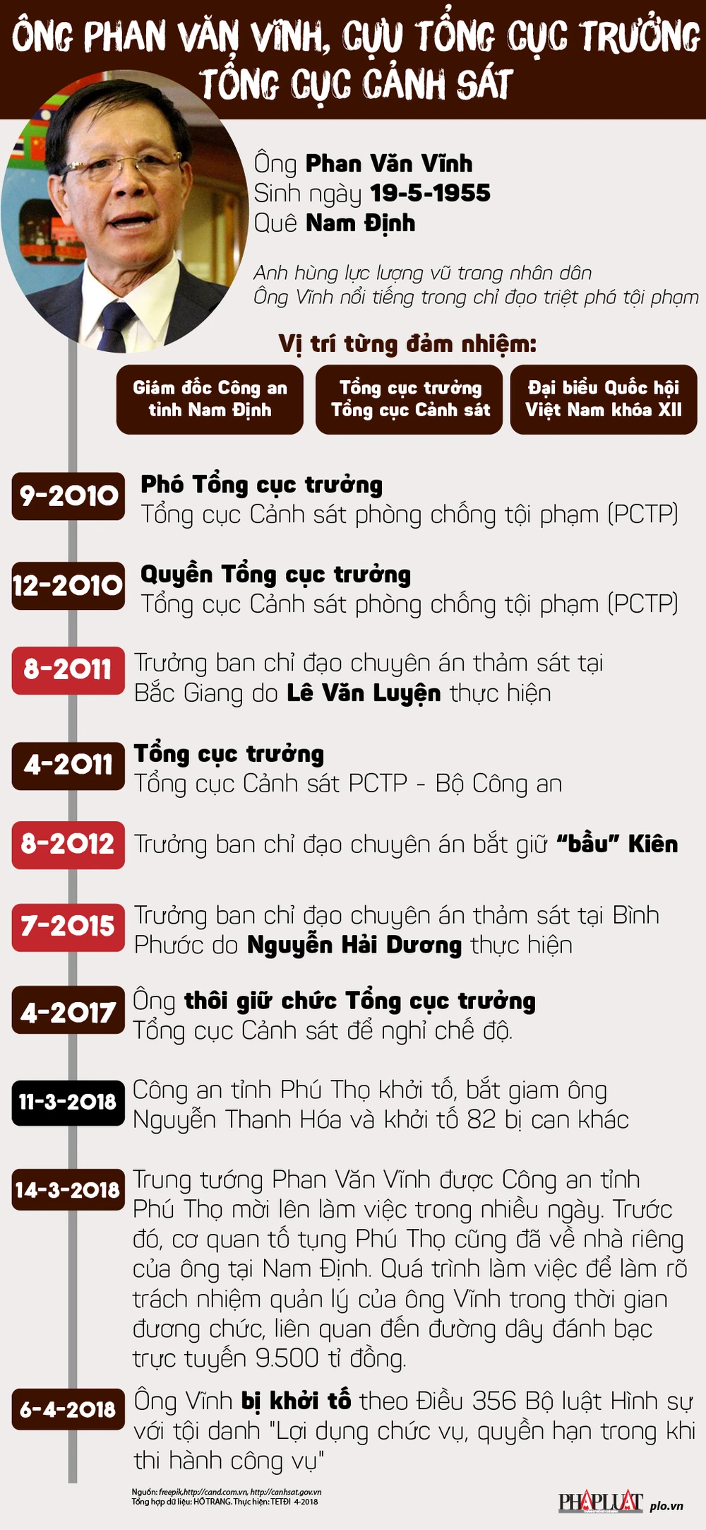 (PLO)- Công an tỉnh Phú Thọ đã bắt ông Phan Văn Vĩnh, cựu Tổng cục trưởng Tổng cục Cảnh sát để điều tra hành vi liên quan đến đường dây đánh bạc xuyên quốc gia với số tiền lên tới hàng ngàn tỉ đồng. Ông từng chỉ huy, phá nhiều chuyên án lớn...