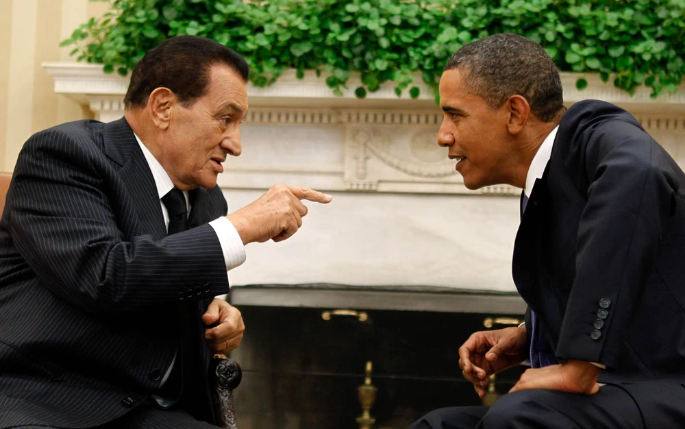Tổng thống Ai Cập Hosni Mubarak (trái) gặp người đồng cấp Mỹ Barack Obama. Ảnh: AL JAZEERA