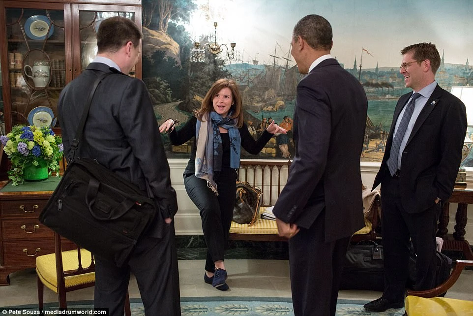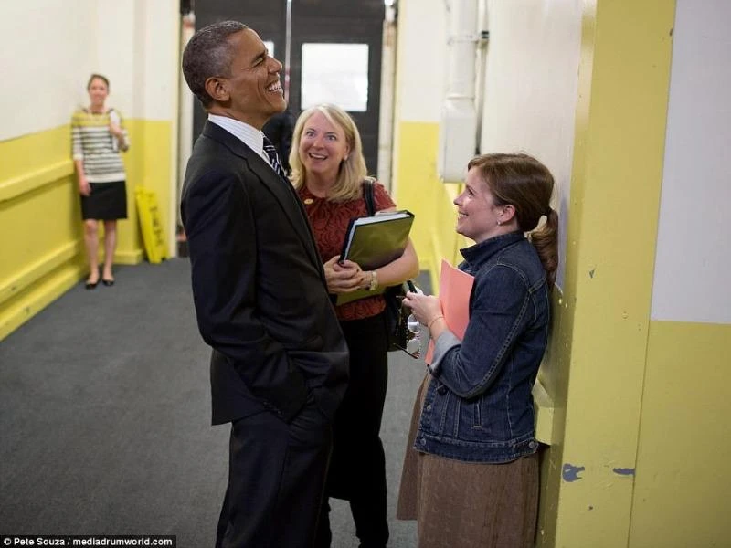 Bà Mastromonaco đang đứng nói chuyện vui vẻ với Cựu Tổng thống Obama khi ông còn đương nhiệm. Ảnh: Pete Souza