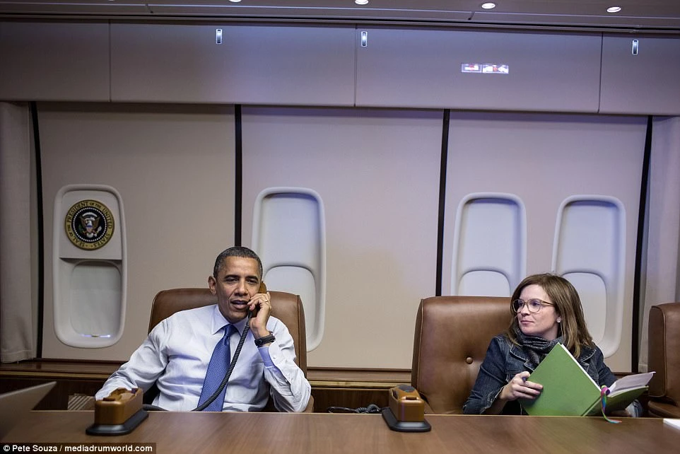 Trên chiếc Không lực Một, Cựu tổng thống Obama gọi điện thoại một cách thoải mái bên cạnh người trợ lý thân cận. Ảnh: Pete Souza