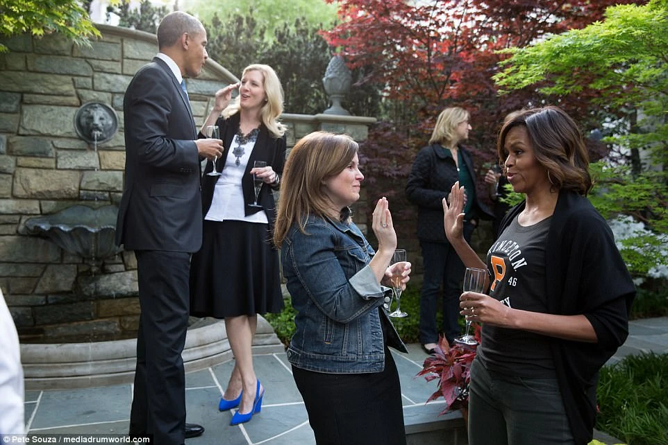 Mastromonaco đang đập tay Đệ nhất phu nhân Michelle Obama trong buổi tiệc chia tay, khi bà xin nghỉ hưu khỏi Nhà Trắng. Ảnh: Pete Souza