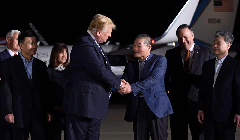 Kim Dong-chul bắt tay với Tổng thống Mỹ Donald Trump khi ba tù nhân Mỹ bao gồm Tony Kim và Kim Hak Song được Triều Tiên thả tại căn cứ chung ở Andrew ở Maryland vào tháng 5-2018. Ảnh: AFP