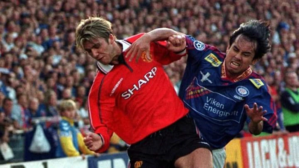 Hải trong trận đối đầu với David Beckham của MU, Anh.