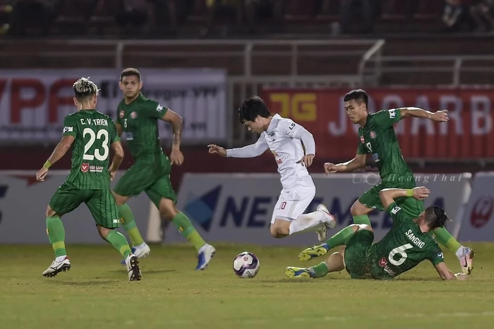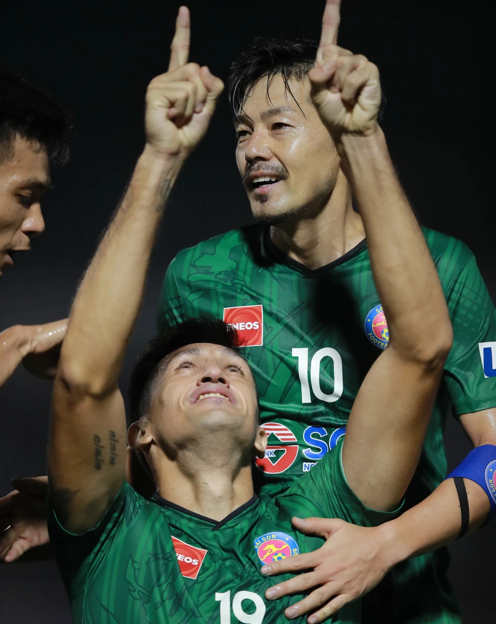 Đội trưởng Matsui ăn mừng bàn thắng với Đỗ Merlo trong trận ra quân thắng HA Gia Lai 1-0. Ảnh: ANH HOÀNG.