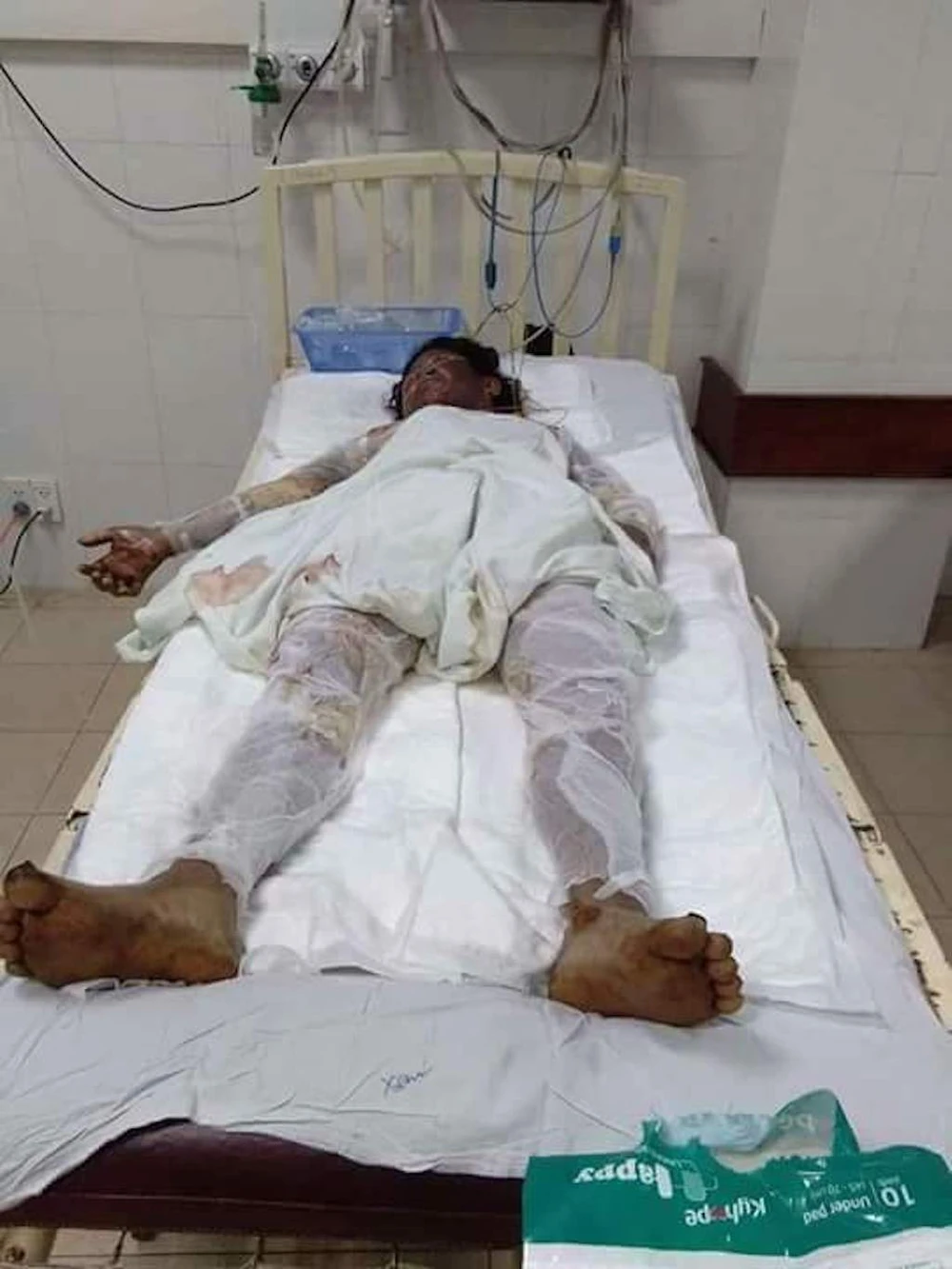 Chị S. đang nằm điều trị tại bệnh viện vì bỏng nặng. Ảnh: TN
