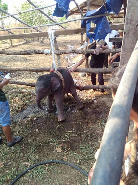 Chú voi hai tháng tuổi được đưa lên khỏi giếng.