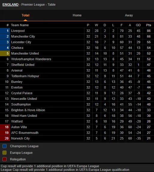 “Hủy diệt” tân vương” Liverpool đến 4-0, Man City vững vàng ở vị trí thứ hai với 66 điểm, hơn đội xếp thứ ba Leicester City đến 11 điểm. Liverpool vẫn dẫn đầu với số điểm 86 nhưng nếu cứ thi đấu thiếu động lực thế này, họ khó hoàn thành mục tiêu kết thúc mùa giải với 100 điểm.
