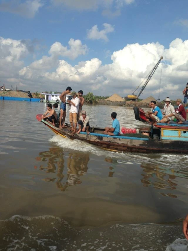 Lực lượng công an và người dân huy động ghe xuồng rồi dùng lưới vây bắt cá sấu.