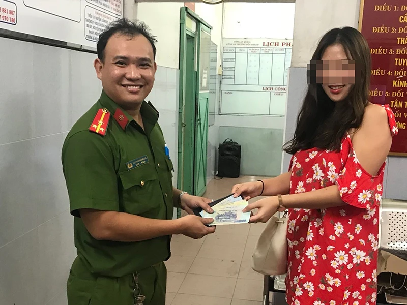 Công an quận 1, TP.HCM trao trả lại tài sản cho một nạn nhân. Ảnh: NT