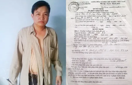 Anh Tuấn sau khi bị đánh rách áo tả tơi (ảnh trái) và quyết định xử phạt hành chính. Ảnh: TD