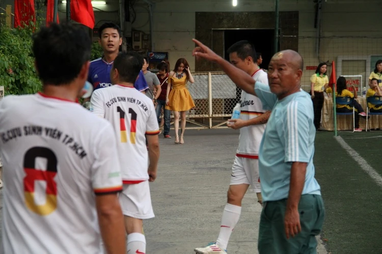 Bên phía Cựu sinh viên TP.HCM, cựu danh thủ Minh “nhí” hào hứng chỉ đạo cầu thủ giữa hiệp.