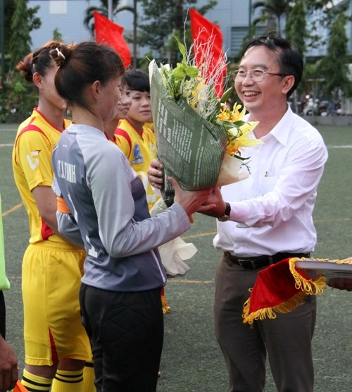 Chủ tịch UBND quận 1 Trần Thế Thuận tặng hoa cho đội trưởng Kiều Trinh của đội tuyển nữ TP.HCM.