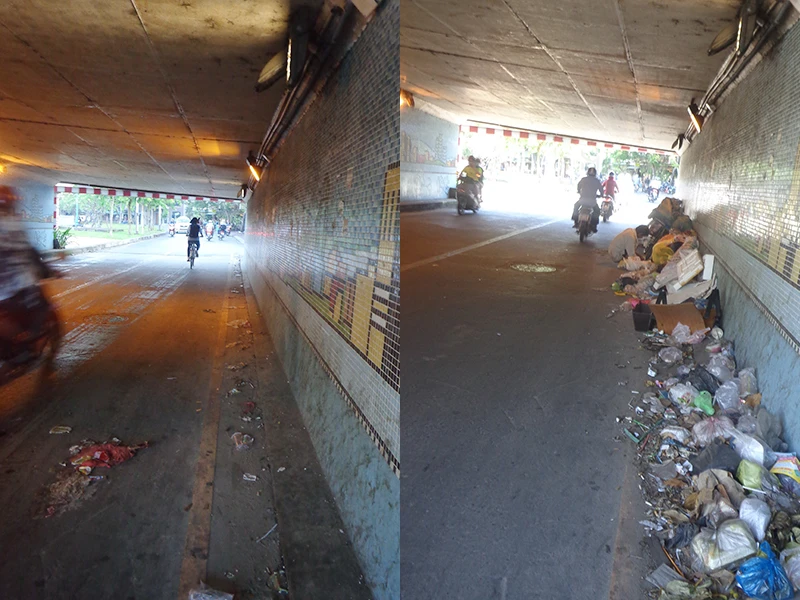 Rác trên vỉa hè, trên các nắp cống và ngay tại trạm xe buýt trông rất phản cảm và ô nhiễm. Bẩn nhất là đoạn chui dưới dạ cầu Kiệu bắc qua kênh Nhiêu Lộc trên đường Hoàng Sa, phường Tân Định, quận 1, TP.HCM trải dài rác trong thời gian qua. Những người ý thức kém đem rác bỏ nơi đây gây ô nhiễm, phản cảm và gây cản trở giao thông (ảnh phải).