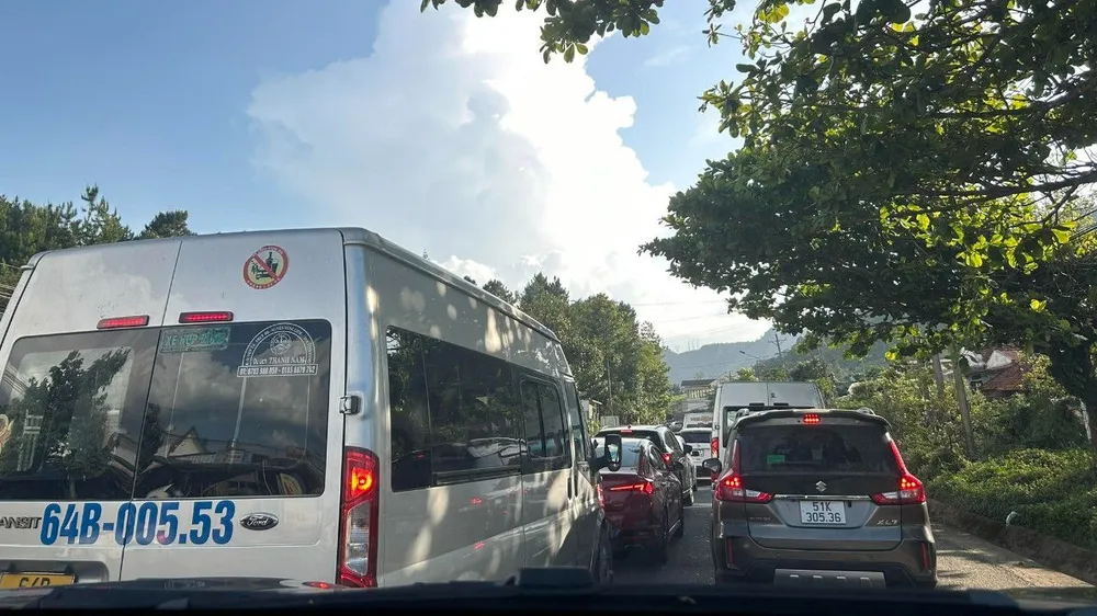 Ùn ứ kéo dài từ đầu đèo Bảo Lộc. Ảnh: LAN TA |