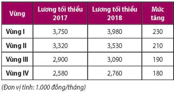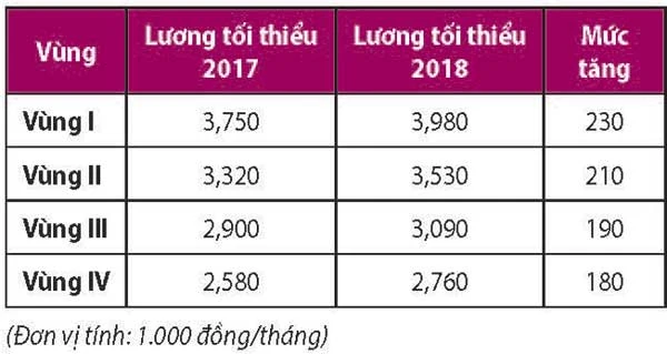Năm trước, sau hai phiên họp, Hội đồng Tiền lương Quốc gia mới thống nhất được mức tăng lương tối thiểu vùng năm 2017. Theo đó, vùng I tăng từ 3,5 lên 3,75 triệu đồng; các vùng II, III và IV tăng tương ứng là 3,32 triệu đồng, 2,9 triệu đồng và 2,58 triệu đồng. Theo tính toán của bộ phận kỹ thuật, mức tăng này đáp ứng được khoảng 93% mức sống tối thiểu của NLĐ.