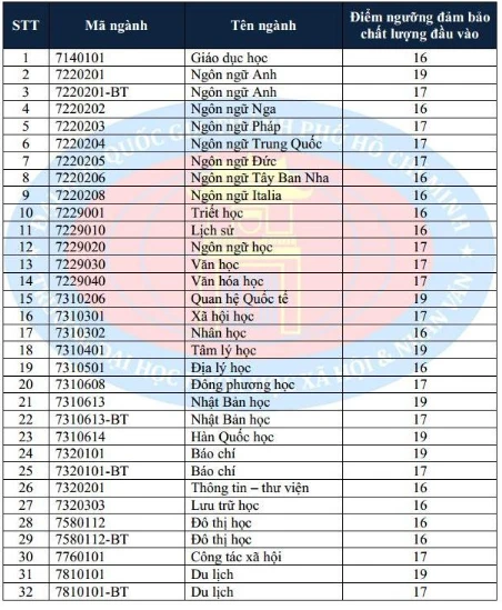 Theo đó, ngành báo chí, quan hệ quốc tế, ngôn ngữ Anh, tâm lý học, Nhật Bản học, Hàn Quốc học lấy ngưỡng xét tuyển cao nhất là 19 điểm.