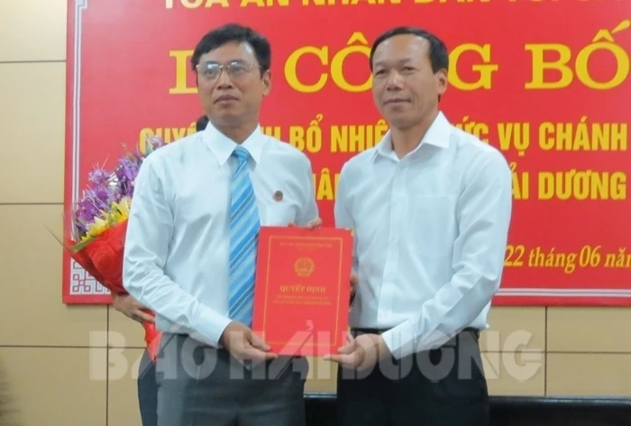 TS Nguyễn Trí Tuệ - Phó Chánh án TAND Tối cao trao quyết định bổ nhiệm chánh án TAND tỉnh cho ông Quang (bên trái). Ảnh: BÁO HẢI DƯƠNG