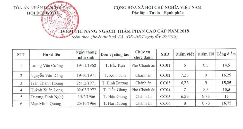 Danh sách kỳ thi tháng 8-2018 có sáu thẩm phán đạt trên 10 điểm thi cho hai môn: Viết và trắc nghiệm. Trong đó, người đạt điểm cao nhất kỳ thi nâng ngạch cao cấp này là thẩm phán Mạc Minh Quang - Chánh án TAND tỉnh Hải Dương. Ông Quang đạt tổng số điểm cho hai môn là 16,75.
