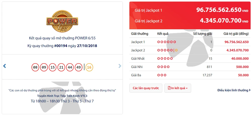 Tại kỳ quay số mở thưởng thứ 194 sản phẩm xổ số tự chọn Power 6/55 ngày 27-10, Công ty Xổ số điện toán Việt Nam (Vietlott) xác định có một vé trúng thưởng Jackpot 1 trị giá hơn 96,7 tỉ đồng (chưa khấu trừ thuế thu nhập cá nhân) được phát hành tại TP.HCM.