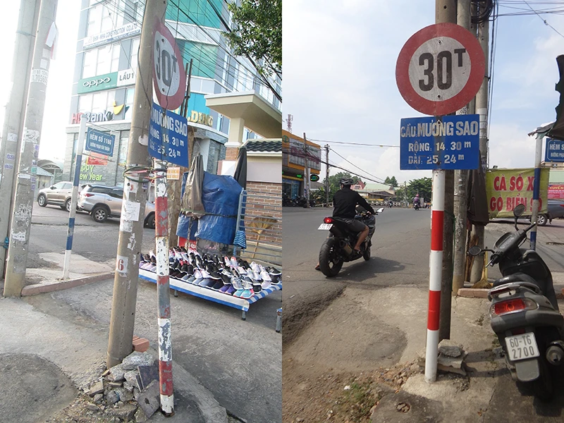 Những người bán hàng cạnh đó cho hay biển báo này bị ô tô húc gãy chân. Để tồn tại biển báo chỉ dẫn cho người đi đường, người dân đành dùng nhiều dây thun buộc ké vào trụ cáp(ảnh 1).