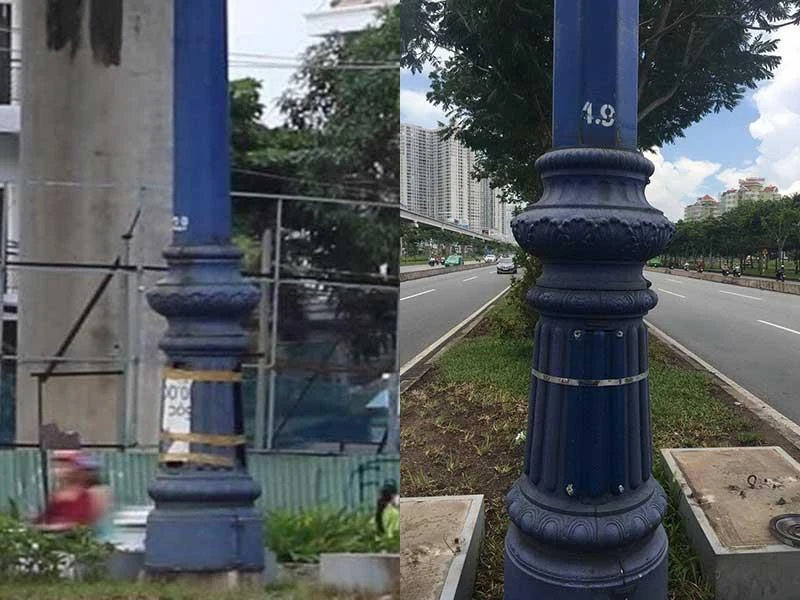 Trụ đèn trên dải phân cách trên xa lộ Hà Nội đoạn từ chân cầu Sài Gòn đến chân cầu vượt Cát Lái bị mất nắp (ảnh trái) và sau khi đã được Công ty cổ phần Chiếu sáng công cộng TP.HCM gắn nắp mới (ảnh phải). Ảnh: NH