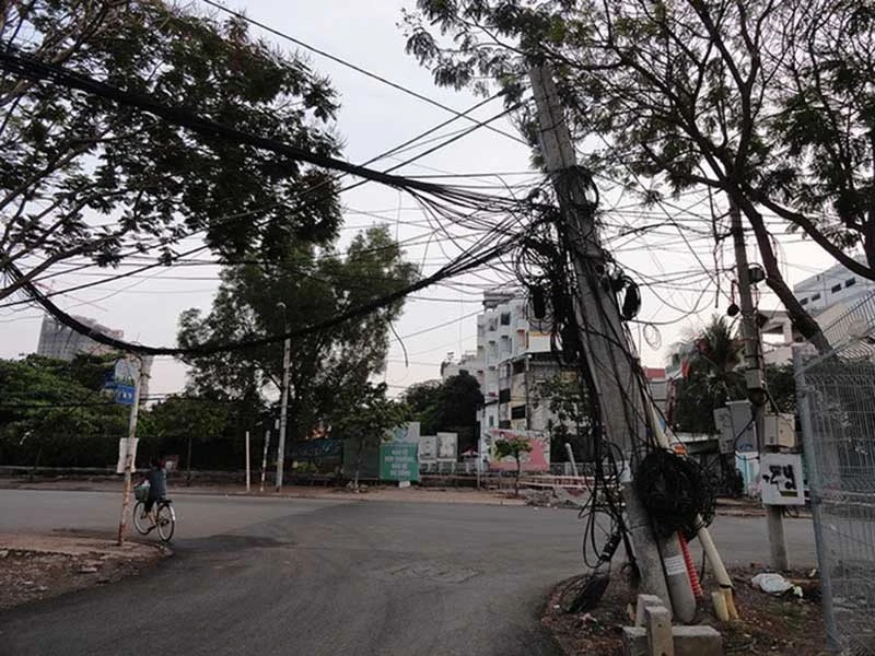 Cặp trụ điện có những cuộn cáp, dây điện thòng lòng, chằng chịt, trụ nghiêng sát ra phía lòng đường, có thể gãy đổ bất cứ lúc nào, gây nguy hiểm cho người đi đường (ảnh 1).
