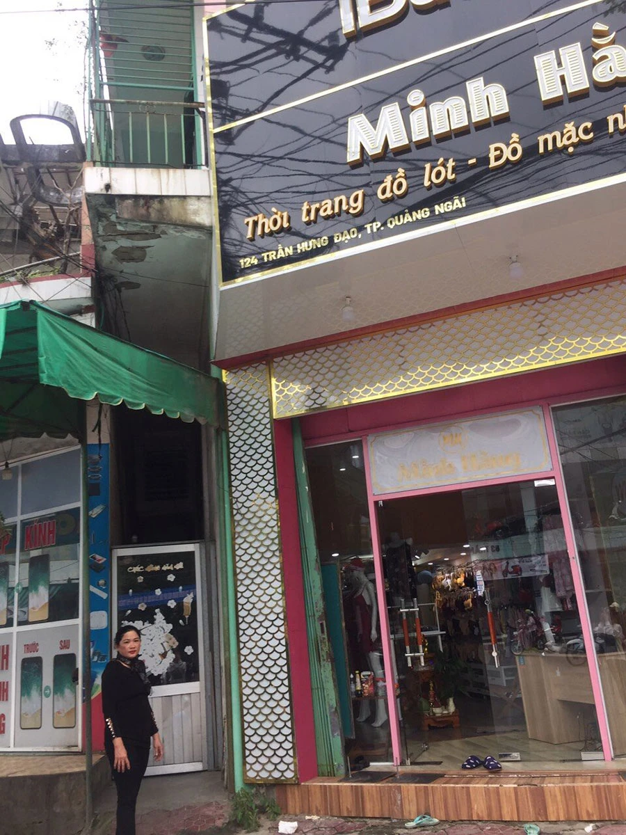 Căn nhà của bà Oanh (có bảng màu đen) và bà Oanh đứng trước lối đi.