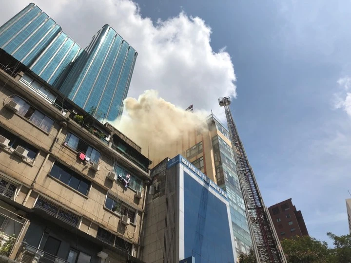 Đám cháy xảy ra ở tầng 11 của tòa nhà. Cột khói vẫn còn đang bốc lên. Hai xe thang bơm nước đang tích cực chữa cháy. Nhiều người dân khu vực gần đó đang tỏ ra rất lo lắng.