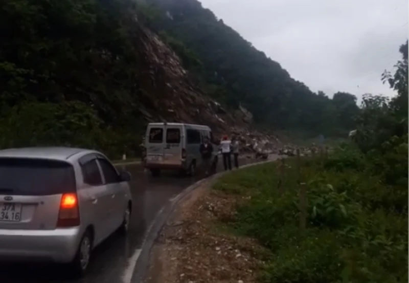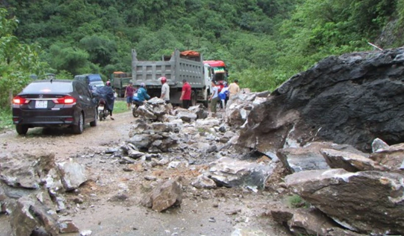 Ách tắc giao thông trên quốc lộ 7A do đá sạt lở.