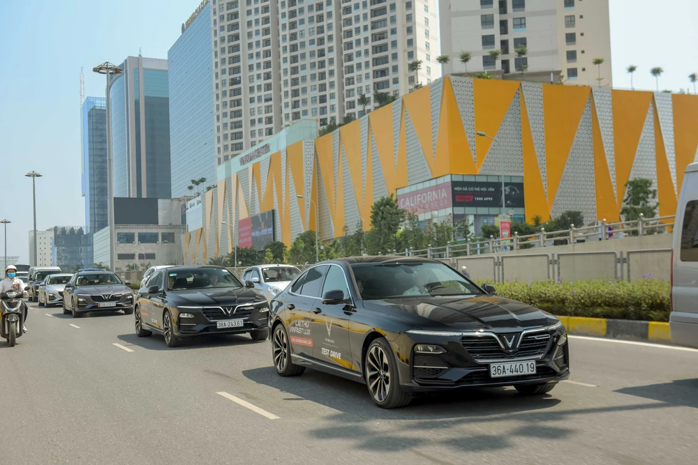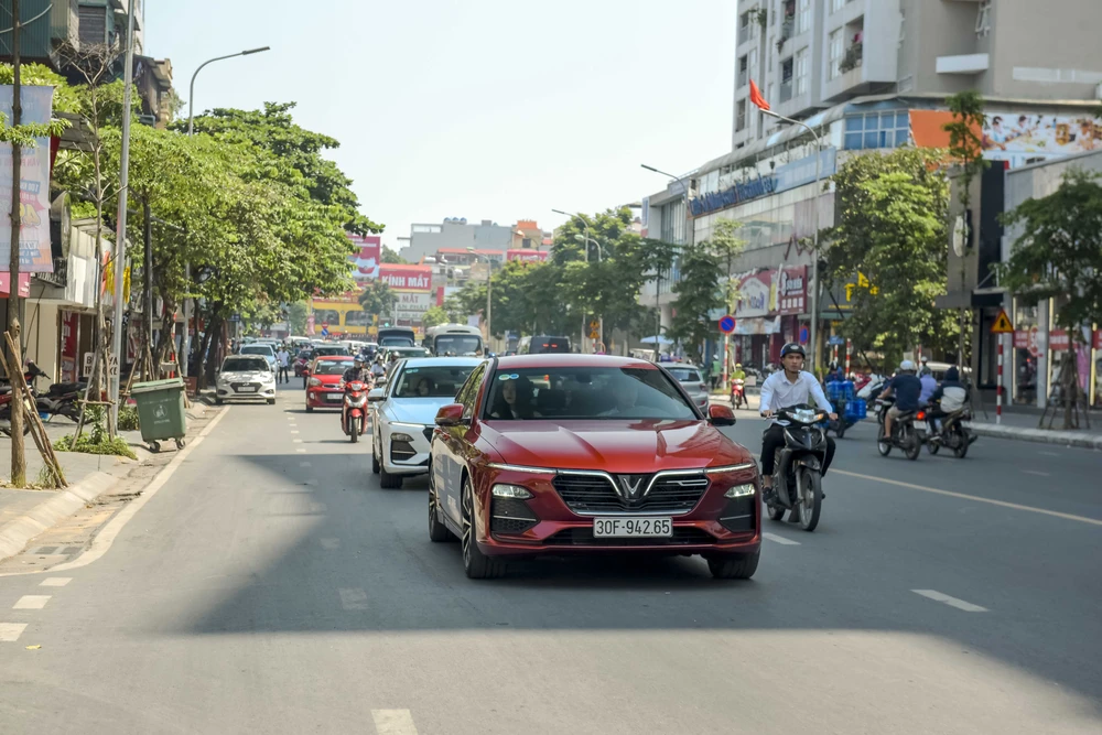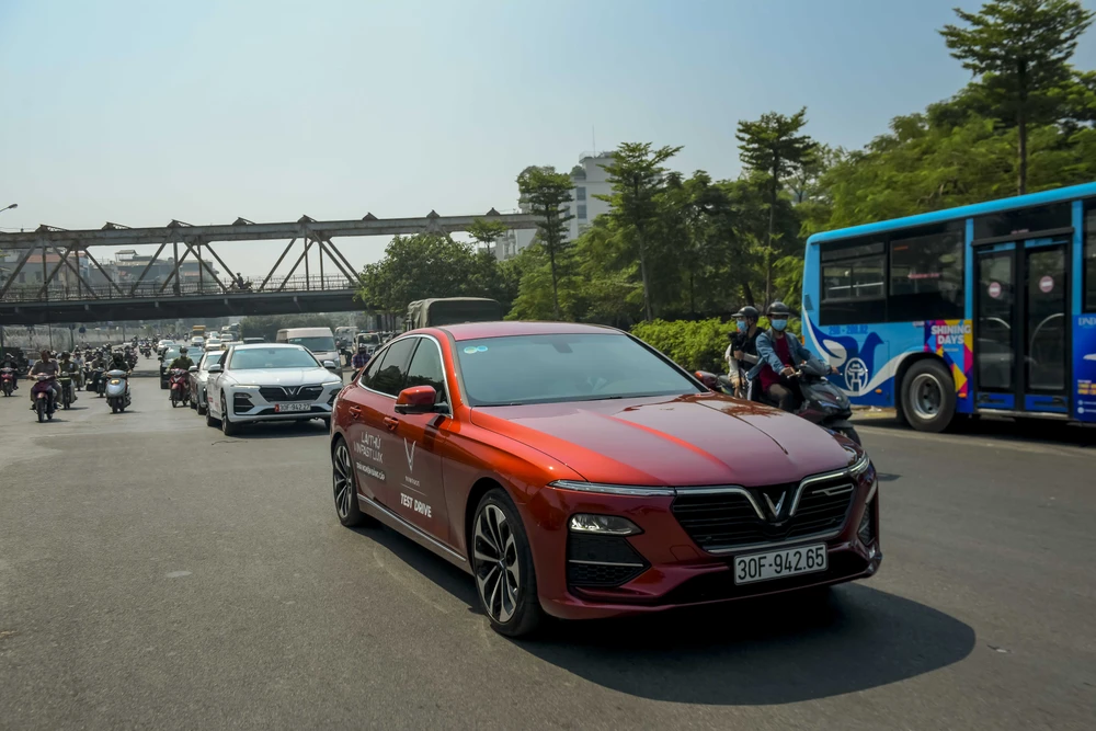 Những chiếc VinFast Lux nối đuôi nhau trên đường phố Hà Nội.