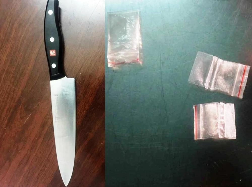 Con dao và chất nghi ma túy trên người ông Lee Sam. Ảnh: CA
