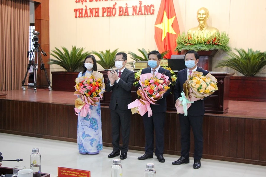 Chủ tịch và hai Phó Chủ tịch HĐND TP Đà Nẵng nhận hoa chúc mừng. Ảnh: TẤN VIỆT