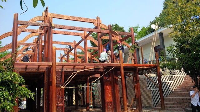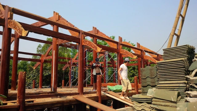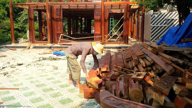 Để xây dựng khu vực biệt thự này, nhiều thợ mộc có tay nghề từ phía Bắc được đưa vào làm suốt gần 8 năm qua. Trước đó, gia đình ông Quang cũng đã tháo dỡ xong căn nhà bát giác lớn nhất trong khu vực biệt phủ. Hiện gỗ, ngói và các chi tiết khác đang được che bạt phủ và bỏ vào trong các căn nhà nhỏ còn lại.