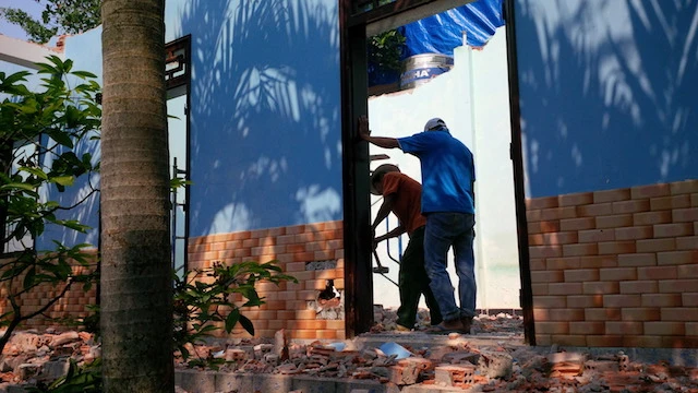 Các công nhân đang tiến hành đập tường nhà. Ảnh: LÊ PHI
