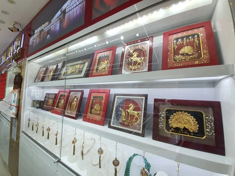 Theo quan sát, ngoài vàng trang sức và vàng khâu, nhiều mẫu vàng hình con chuột, thần tài… với đủ kích thước được rất nhiều người chọn mua. Ngoài ra, nhiều bức tranh bằng vàng đẹp mắt cũng được trưng bày nhưng kén người mua hơn.