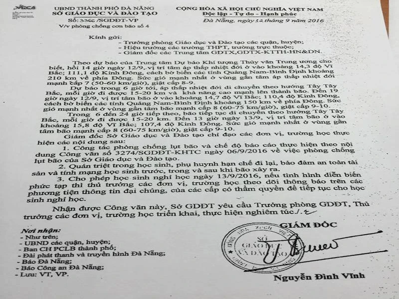 Đến thời điểm này, ông Nguyễn Đình Vĩnh (Giám đốc Sở GD&ĐT TP Đà Nẵng) đã có công văn gửi các đơn vị, trường học cho phép học sinh nghỉ học từ ngày 13-9 do ảnh hưởng của ATNĐ có khả năng mạnh lên thành bão.